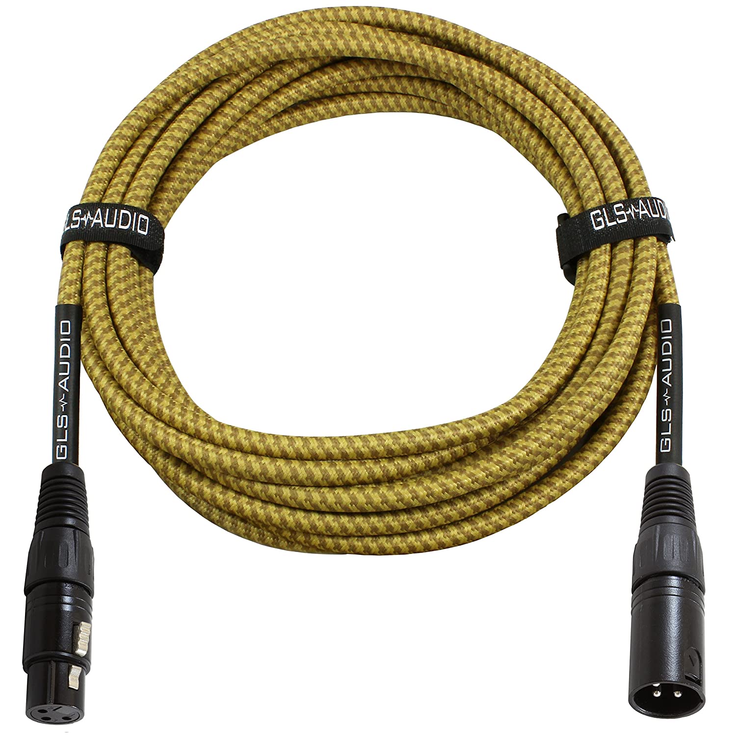 GLS Audio 25 Foot Mic Cable Balanced XLR Patch Cords - XLR Male to XLR Female 25 FT Microphone Cables Brown Yellow Tweed Cloth Jacket - 25 Feet Mike P