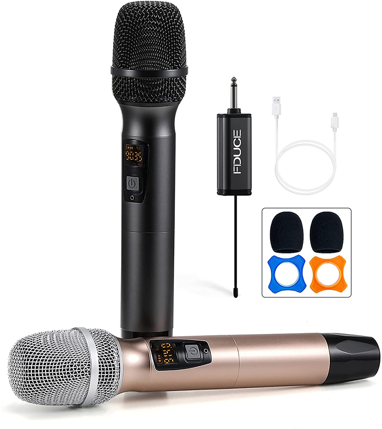 Wireless Microphone, Karaoke Mic, FDUCE UHF Dual Handheld Dynamic System with Rechargeable Receiver for Party, Church, Meeting, Wedding, 260ft (Grey and Gold)