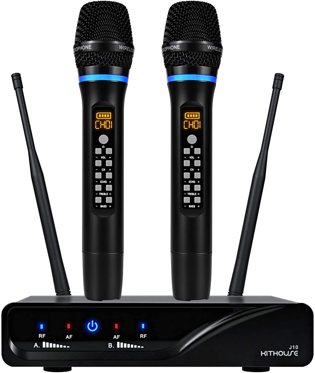 Kithouse J10 Wireless Microphone Karaoke System Rechargeable, UHF Metal Cordless Microphone Handheld with Volume Echo Treble BASS Control and Receiver Box for Singing Karaoke Speech Meeting