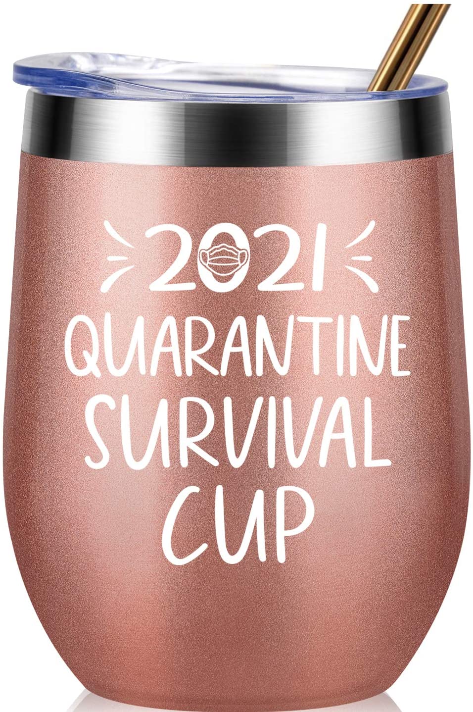 2021 Quarantine Survival Cup - Gifts for Women, Men, Friend, Sister, Mom, Grandma, Aunt, Daughter, Coworker - 30th, 40th, 50th, 60th Birthday Gift Ideas, Insulated Wine Tumbler, 12 Ounce Rose Gold