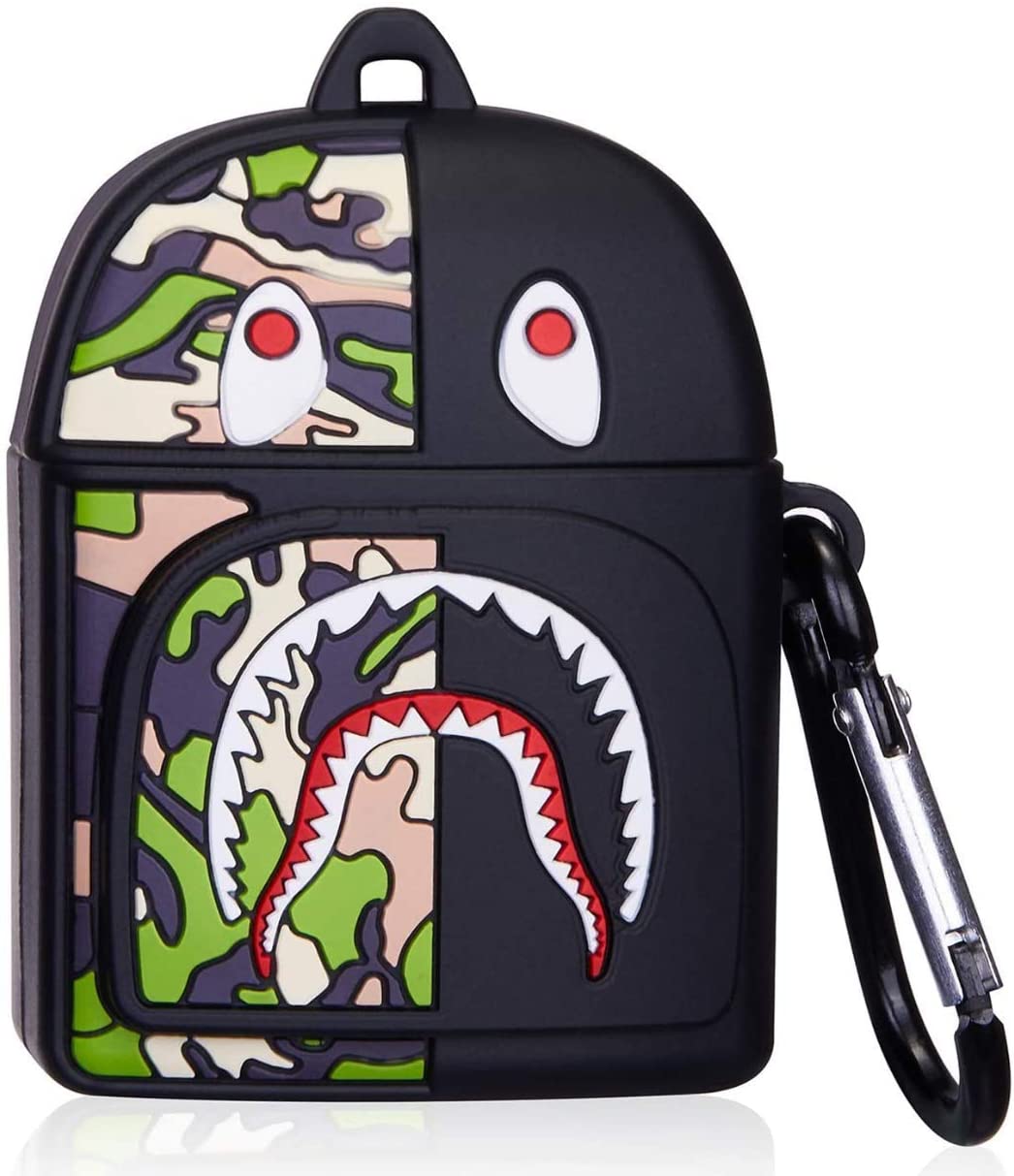 Applicable Airpods 1&2, 3D Cute Cartoon camo Shark airpods case, with Keychain (Blue Whtie)