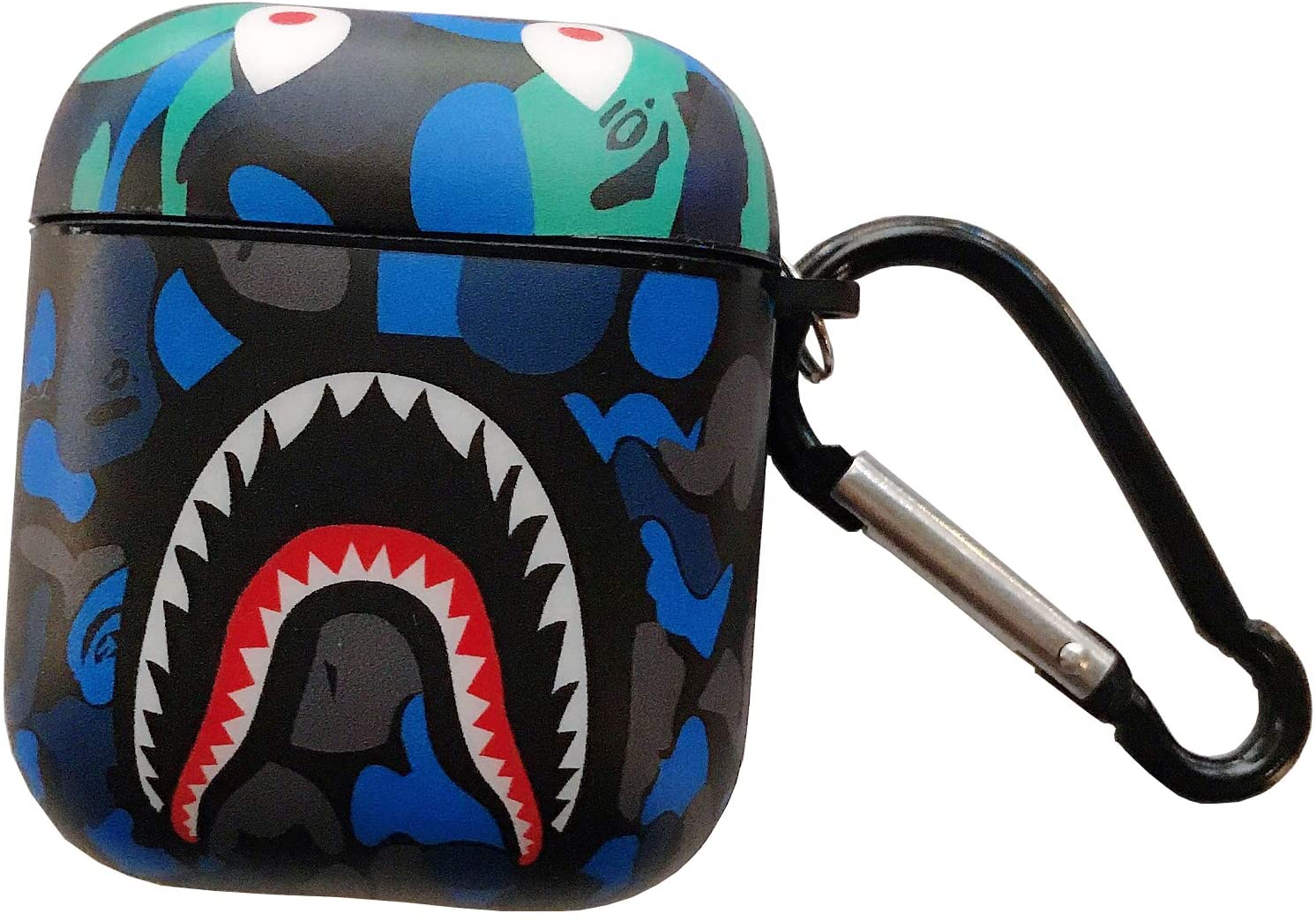 Shark Teeth Softshell Silicone Camo Airpods Case, IMD Silicone case, Wireless Charging case, Carabiner Key Chain Set, Suitable for Apple airpod 1/2 (IMD Blue)