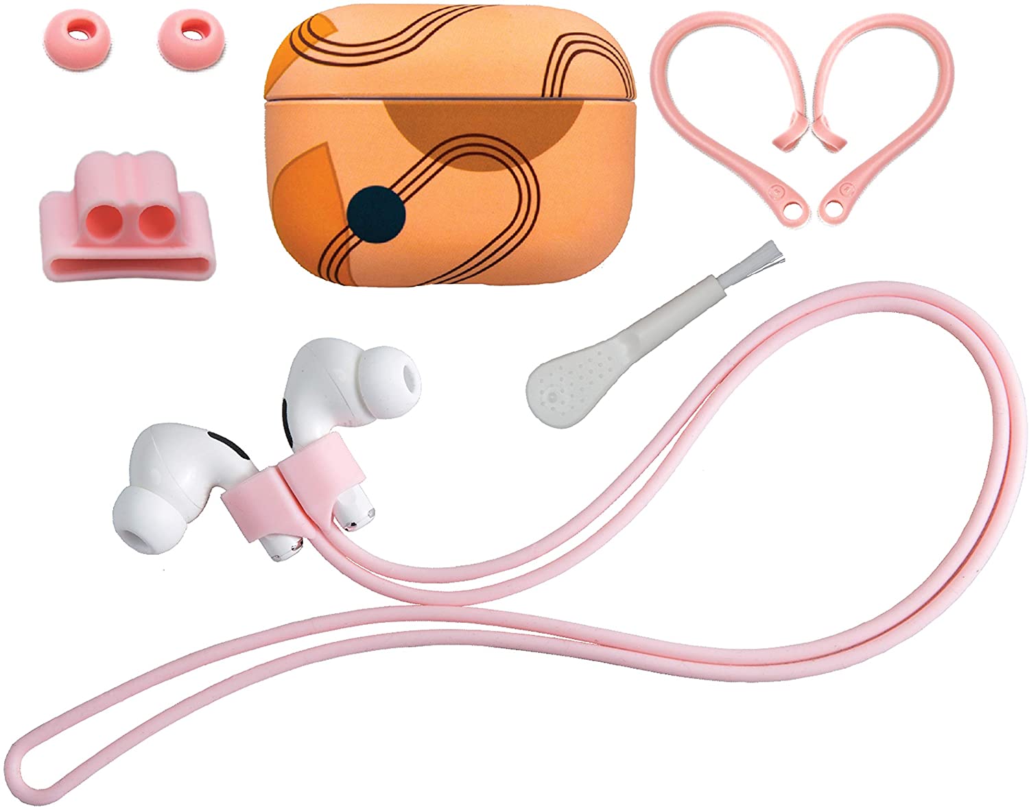 Fivemix Pink Matching Set of Airpods Pro Silicone Protective Shockproof Case - Pair of EarTips - Airpod Watch Strap Holder - Magnetic Strip Airpod Holder - Ear Hooks- Brush for Airpods (Yellow Pink)